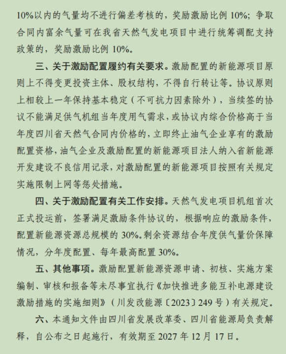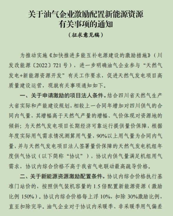 通知指出,为推动实施《加快推进电源建设的激励措施》(川发改能源〔2022〕721号),细化明确油气企业激励配置新能源资源有关工作要求,促进天然气发电项目加快建设,结合四川省实际,省发展改革委(省能源局)研究起草了《关于油气企业激励配置新能源资源有关事项的通知(征求意见稿)》。意见稿中明确,对油气企业,有条件最高按照供气装机容量的1.5倍配置新能源资源。