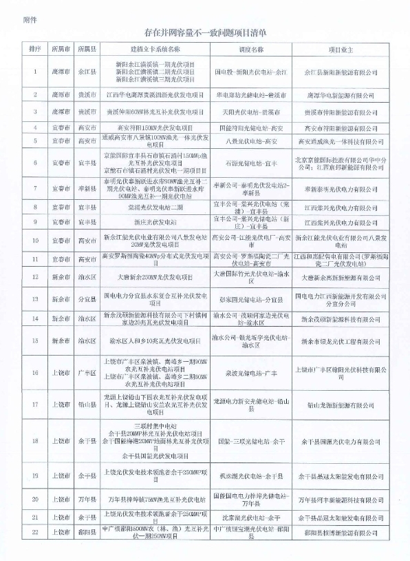 根据国家关于可再生能源绿色电力证书2024年全覆盖工作要求,我局印发了《关于进一步做好可再生能源发电项目建档立卡工作的通知》(赣能新能字〔2024〕109号),各地各单位认真落实通知要求,已基本完成了可再生能源发电项目建档立卡信息填报工作。在信息审核过程中发现,有部分项目存在发电企业填报的项目并网容量与电网企业反馈的项目并网容量不一致问题,导致建档立卡后续工作无法完成。