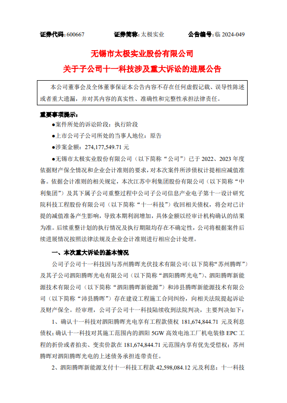 2、十一科技与山东腾晖光电有限公司(以下简称“山东腾晖光电”)、苏州腾晖之间的建设工程施工合同纠纷,公司就终审裁定情况披露了《关于子公司十一科技涉及重大诉讼的进展公告》(公告编号:临 2024-015)。法院判决山东腾晖光电支付十一科技工程款 56,705,052.98 元及利息;苏州腾晖对上述债务承担连带清偿责任;十一科技对其施工的“山东3gw高效电池工厂机电装修epc工程”折价或者拍卖价款享有优先受偿权。截至本公告披露日,该案件的一审判决已发生法律效力。