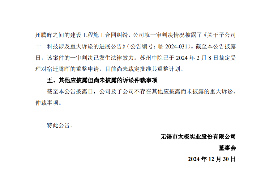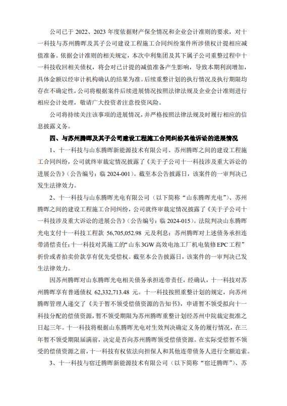 3、十一科技与宿迁腾晖新能源技术有限公司(以下简称“宿迁腾晖”)、苏州腾晖之间的建设工程施工合同纠纷,公司就一审判决情况披露了《关于子公司十一科技涉及重大诉讼的进展公告》(公告编号:临 2024-031)。截至本公告披露日,该案件的一审判决已发生法律效力。苏州中院已于 2024 年 2 月 8 日裁定受理对宿迁腾晖的重整申请,目前尚未裁定批准其重整计划。