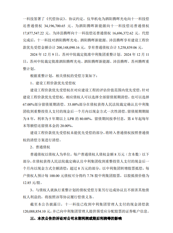 2024 年 12 月 9 日,苏州中院裁定批准中利集团重整计划。2024 年 12 月 11日,苏州中院裁定批准泗阳腾晖光电、泗阳腾晖新能源、沛县腾晖、苏州腾晖重整计划。