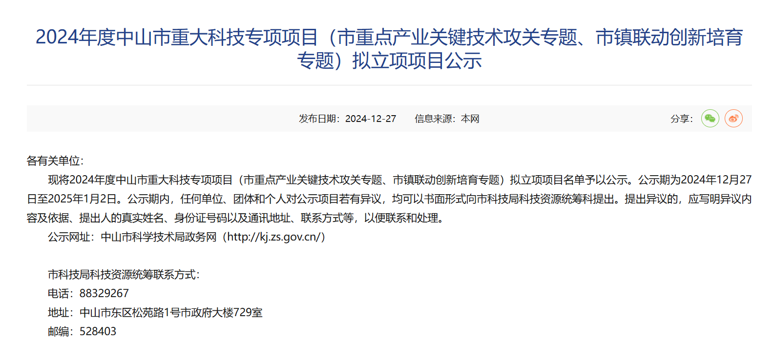 12月27日,中山市科技局就2024年度中山市重大科技专项项目(市重点产业关键技术攻关专题、市镇联动创新培育专题)拟立项项目名单予以公示。公示期为2024年12月27日至2025年1月2日。