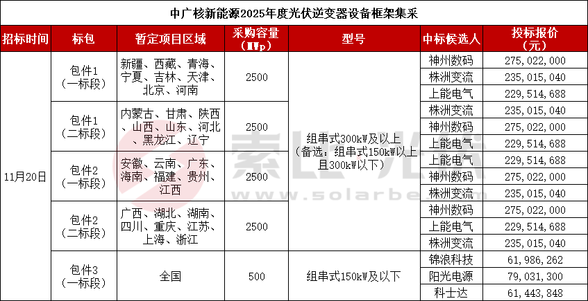 近日,2025年度光伏逆变器设备框架集采中标候选人公示。本次采购招标人为中广核风电有限公司,分为3个包件;共计分为5个标段,采购容量共计10.5gw,框架合同签订到2025年12月31日,投标人的交货进度必须满足招标人进度的要求。